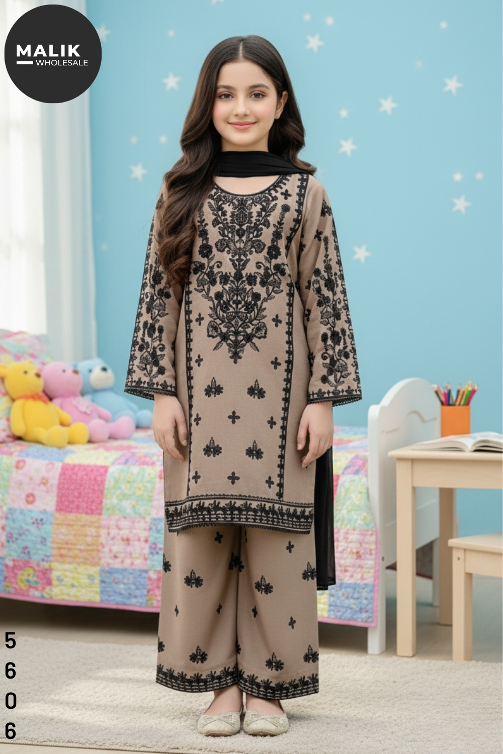 Introducing our Girls Dhanak Midi Shirt—a graceful fusion of comfort, tradition, and style. Crafted from premium Dhanak fabric, this stitched and embroidered outfit ensures warmth and elegance throughout the winter season. The shirt features intricate black embroidery on a soft beige base, full sleeves, and a straight-cut midi length for a modest yet fashionable silhouette. Designed to provide all-day comfort, it pairs effortlessly with matching trousers for a complete ethnic look. Ideal for family gatherings, festive wear, and everyday elegance.