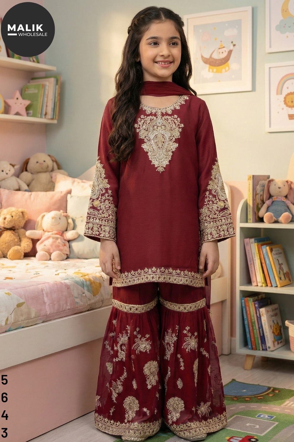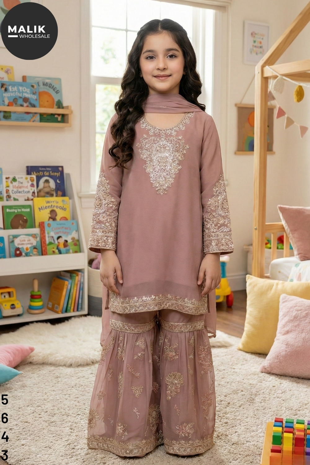 Elevate festive collections with the graceful charm of the 5643 – Girls 3Pcs Embroidered & Stitched Chiffon Sharara Set, thoughtfully crafted for elegance and comfort. This beautifully stitched outfit is made from premium-quality chiffon, offering a lightweight, breathable, and flowy feel that keeps young girls comfortable throughout long celebrations.