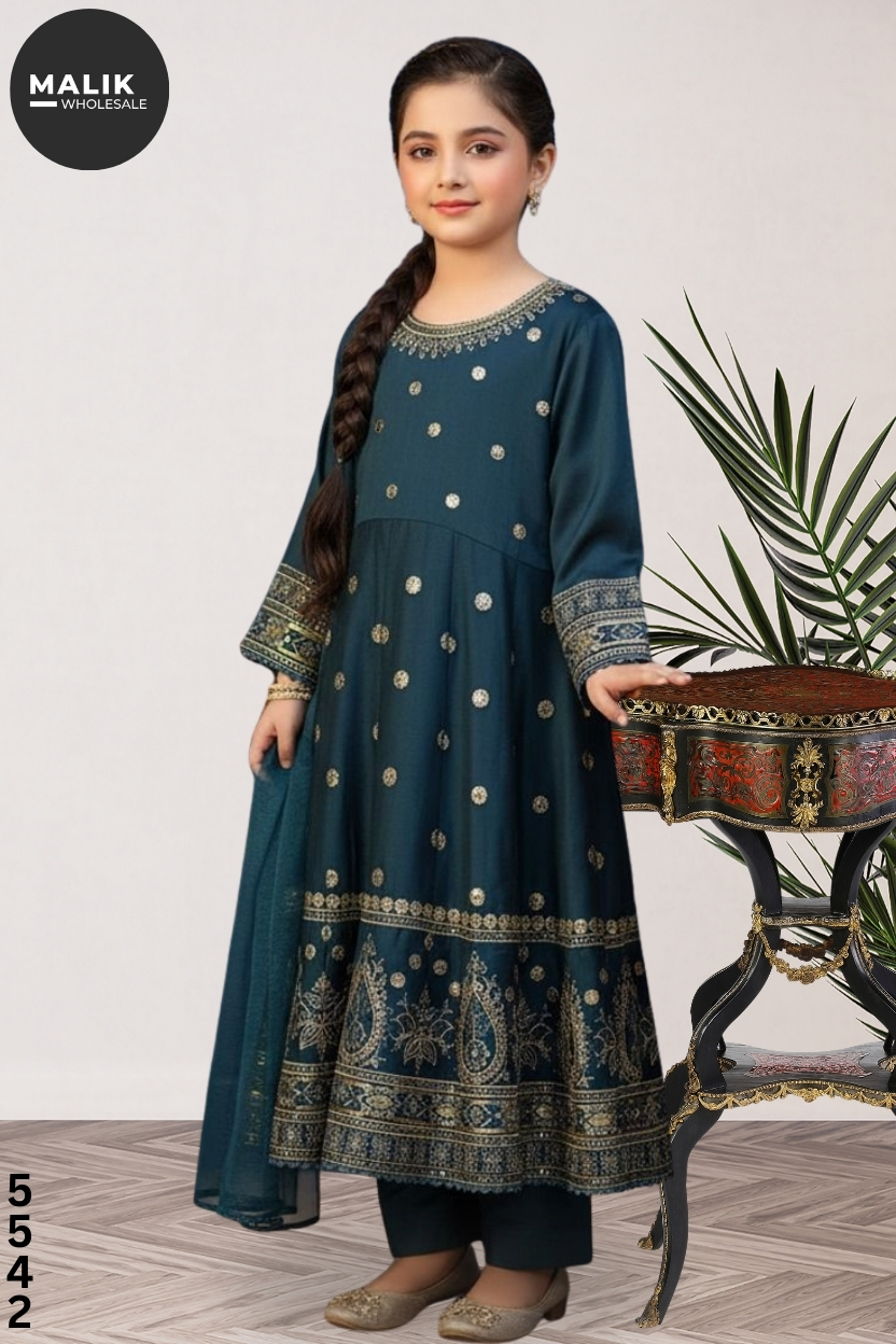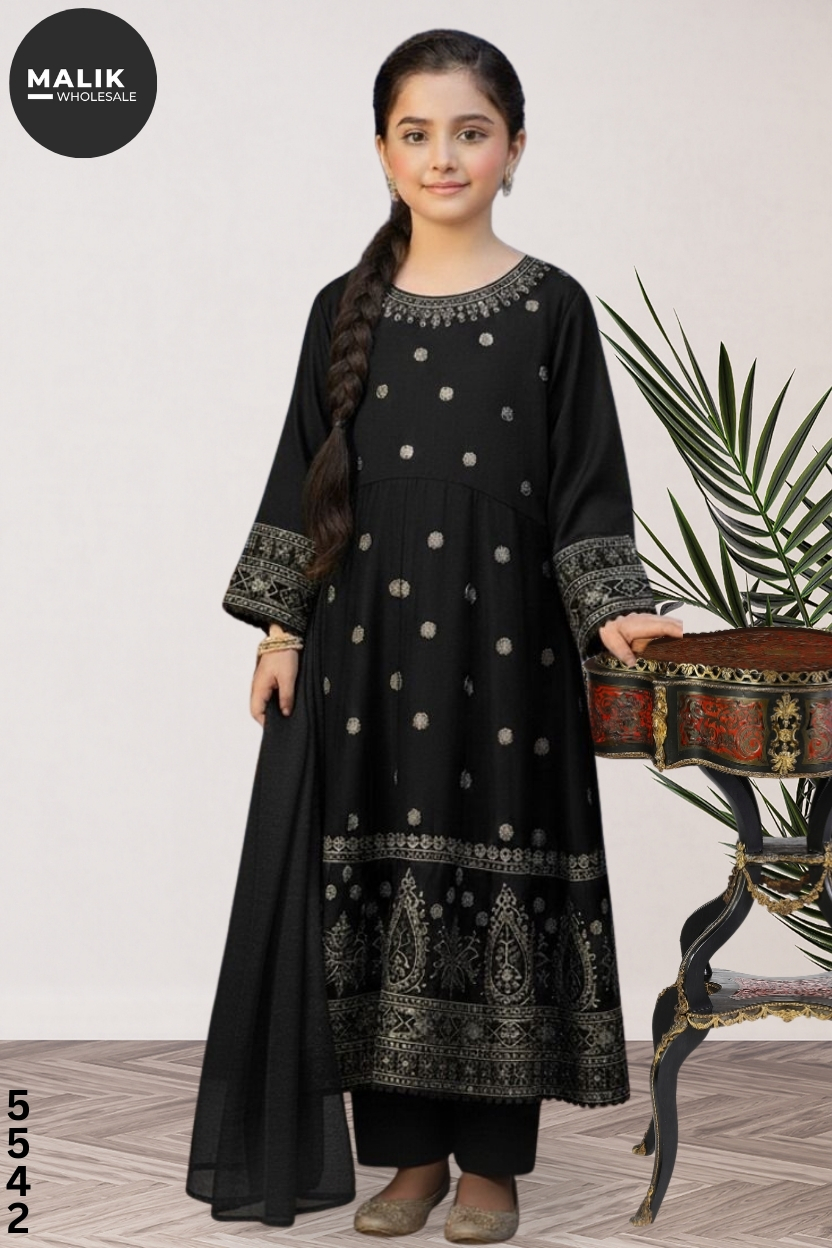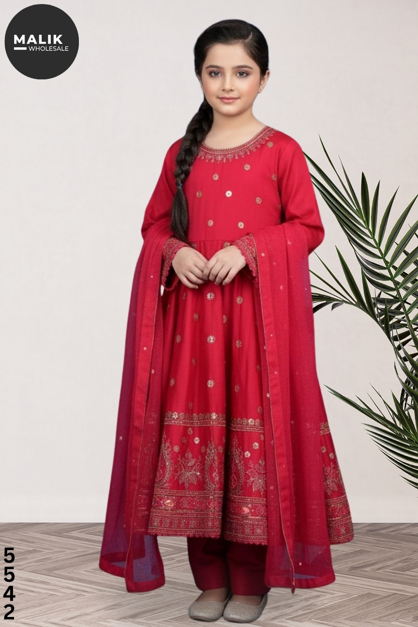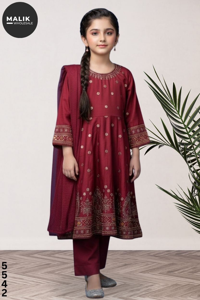 Girls 3-Piece Embroidered & Stitched Viscose Frock – Code 5542.Available in sizes 20–36, packed 9 pcs per set. Premium viscose fabric with elegant embroidery, fully stitched and ready to wear—perfect for boutiques and winter collections.
