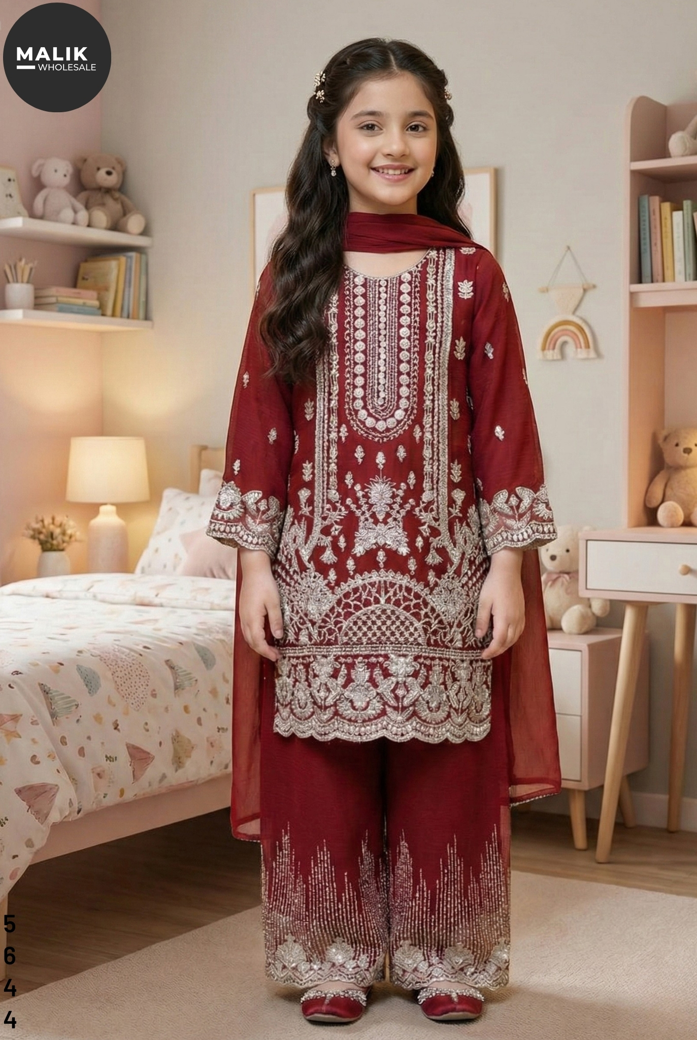 Introducing 5642 – Girl’s 3Pcs Embroidered & Stitched Chiffon Sharara, a premium festive outfit crafted to make every little girl look graceful and elegant. Made from high-quality Pakistani chiffon, this 3-piece set includes a fully embroidered shirt showcasing intricate threadwork and mirror-inspired detailing. The matching sharara features stunning embroidered patterns along the borders, adding a luxurious traditional touch. A soft chiffon dupatta with delicate edging completes the regal look.