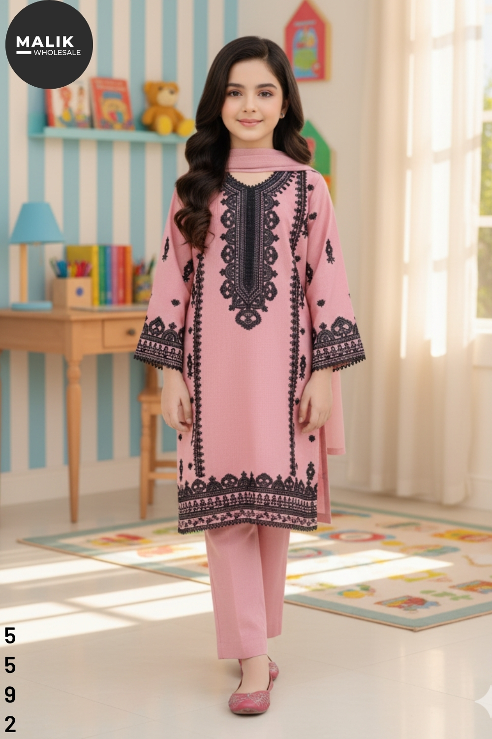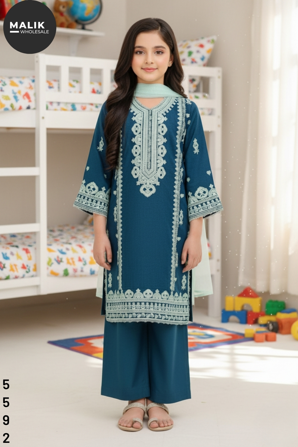 Upgrade your winter kids’ collection with our 5592 Girls 3-Pcs Embroidered & Stitched Dhanak Midi Shirt Set—a perfect blend of style, comfort, and premium craftsmanship. This elegant outfit is designed in soft, warm Dhanak fabric, making it ideal for the winter season. The embroidered midi shirt features intricate detailing on the neckline, sleeves, and hem, giving it a beautifully traditional and graceful look.
