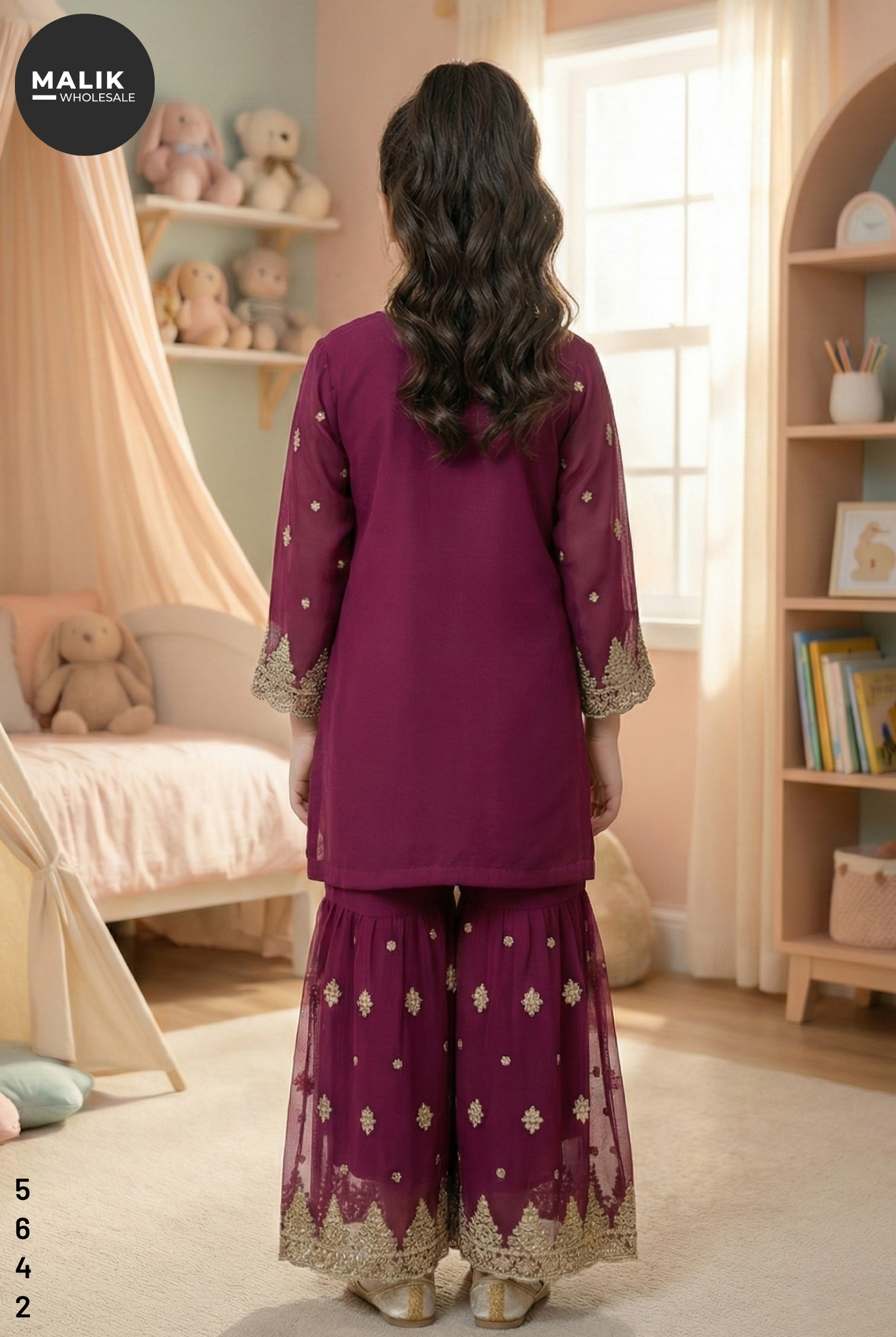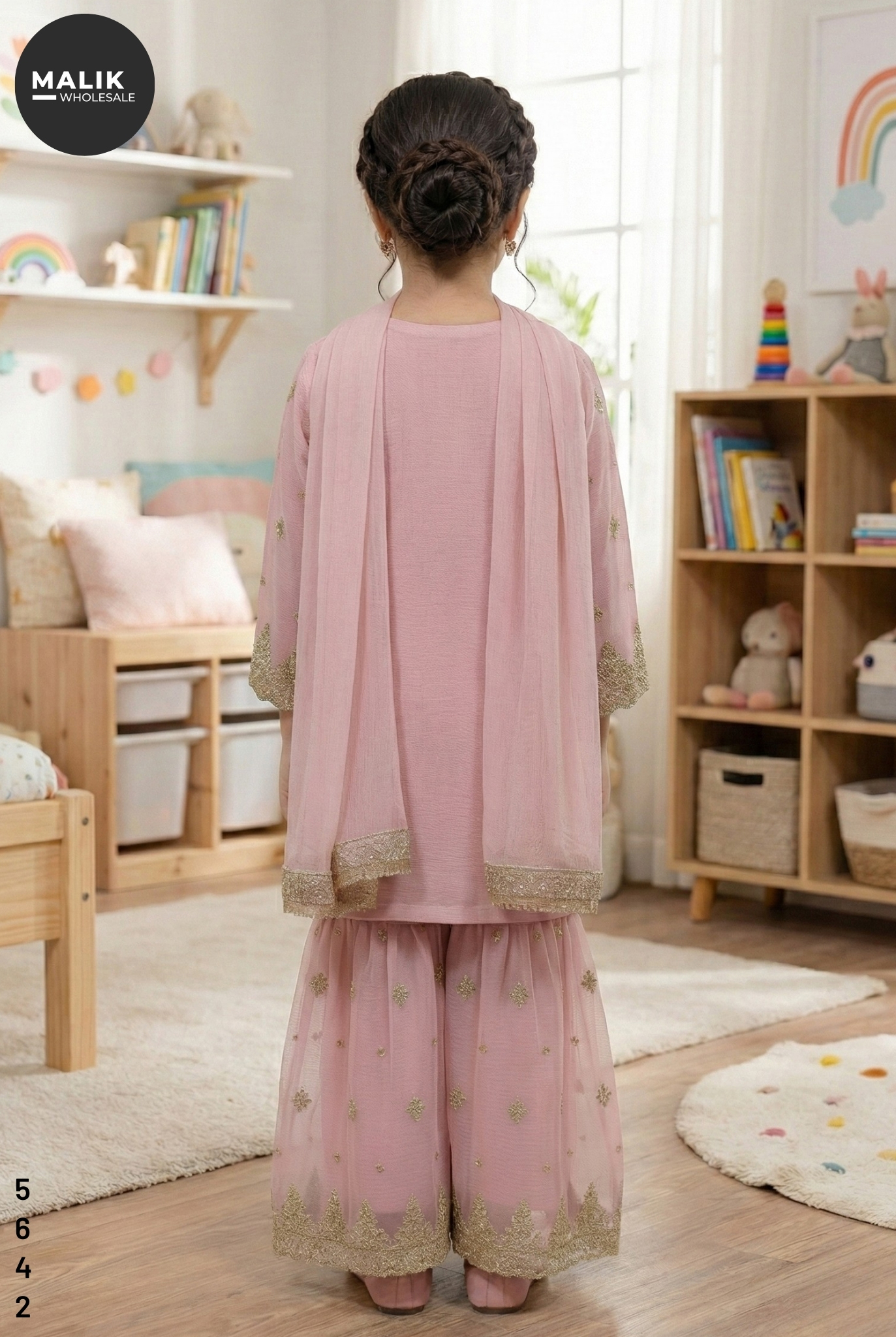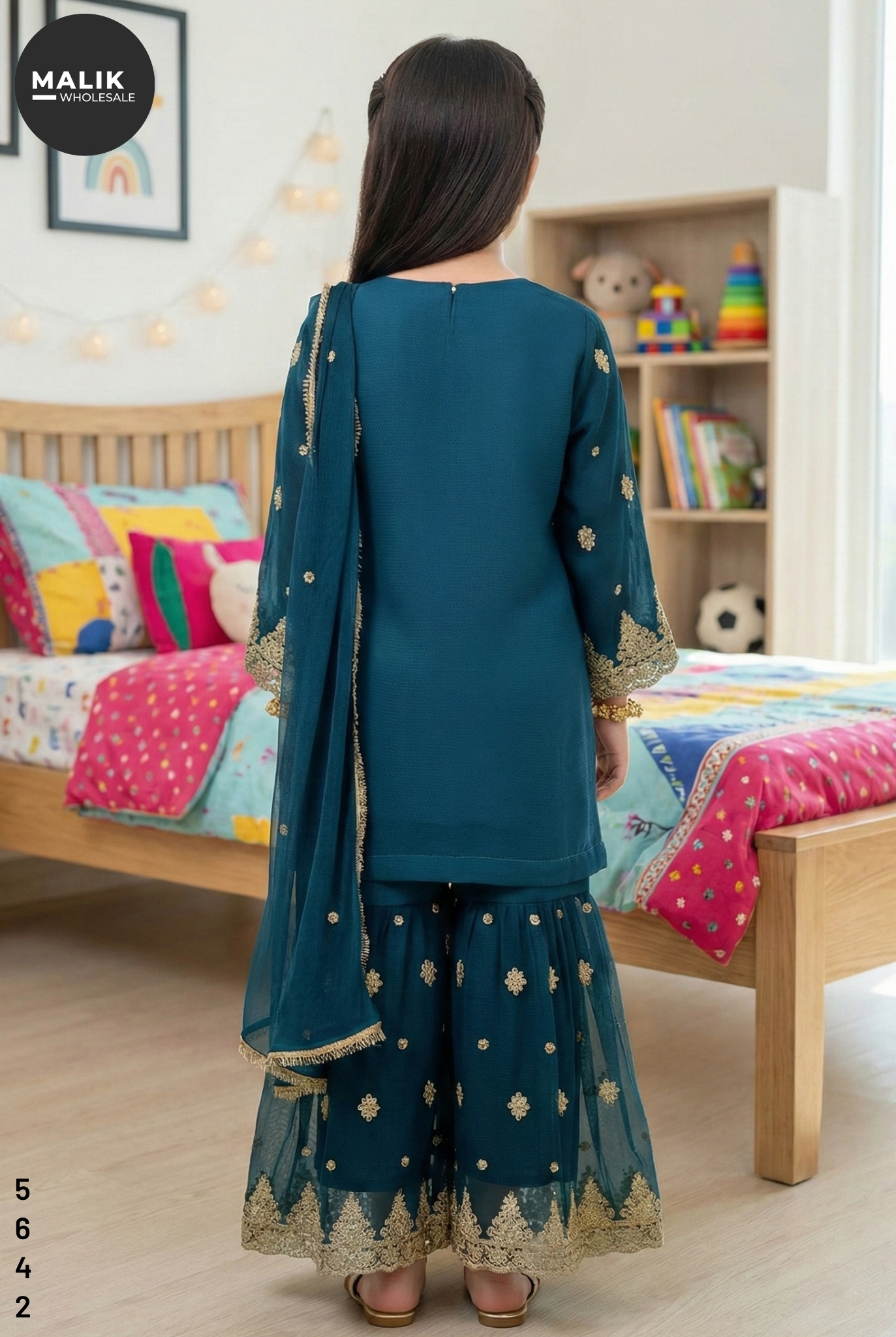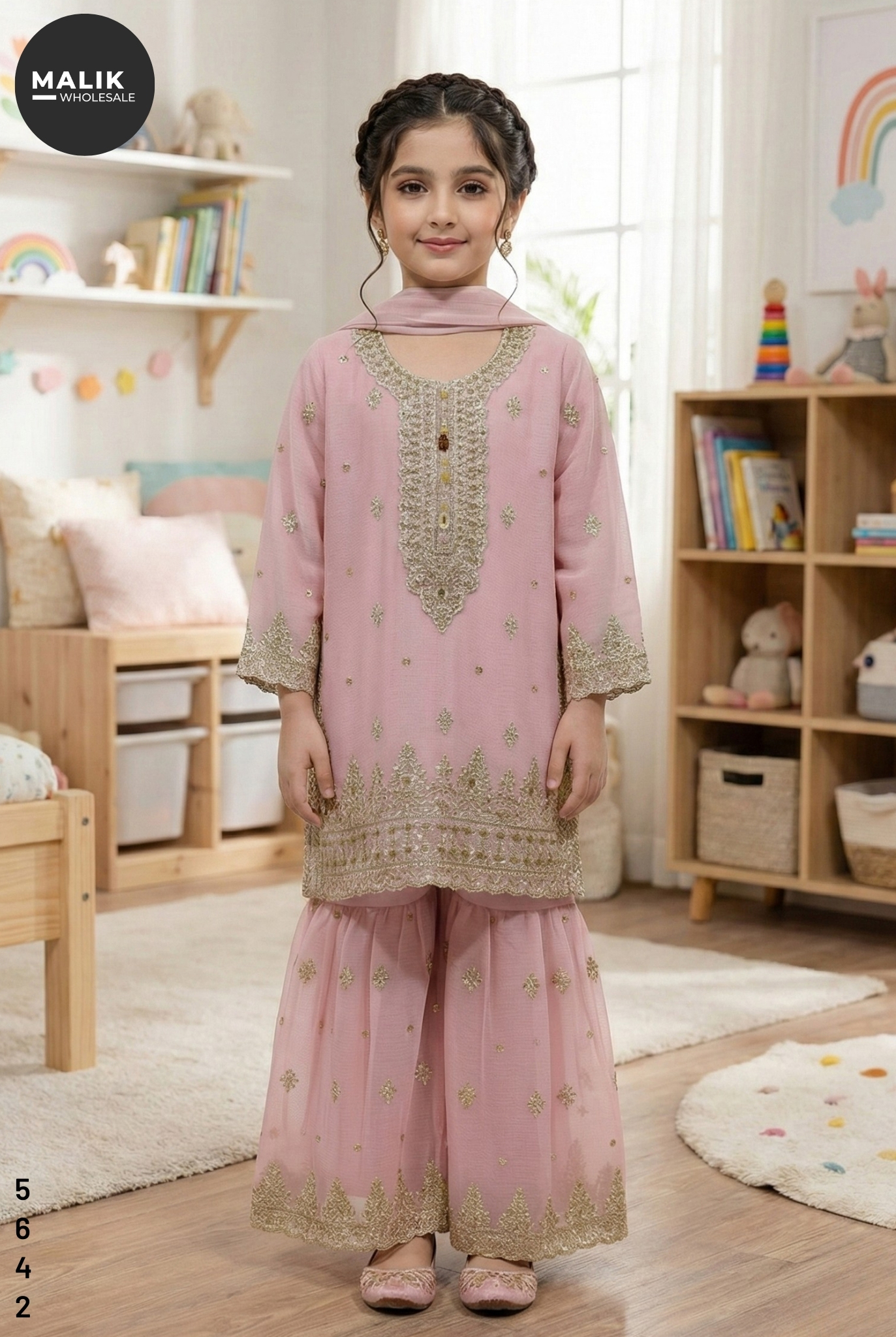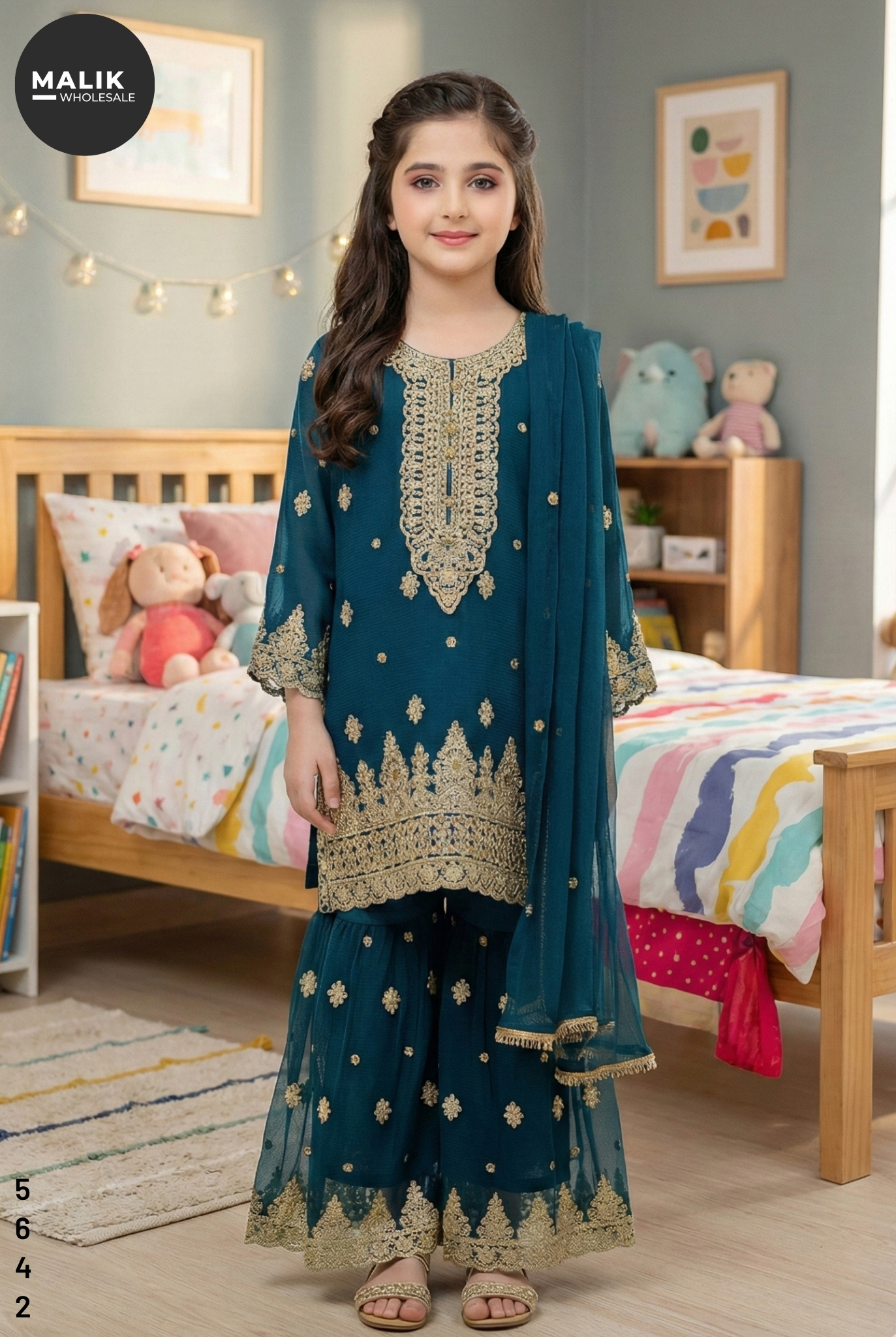 Make every celebration special with the stunning 5642 – Girl’s 3Pcs Embroidered & Stitched Chiffon Sharara from Malik Wholesale. This exquisite outfit is crafted from premium-quality chiffon, dyed in an elegant multi-tone, and adorned with intricate golden embroidery from the neckline to the hem. The shirt features delicate motifs and finely crafted lace borders, giving it a royal, festive look. The matching sharara comes with beautifully embroidered net panels, adding graceful flair and volume for a picture-perfect traditional appearance. A soft chiffon dupatta completes the ensemble, keeping it light, comfortable, and easy for kids to carry.