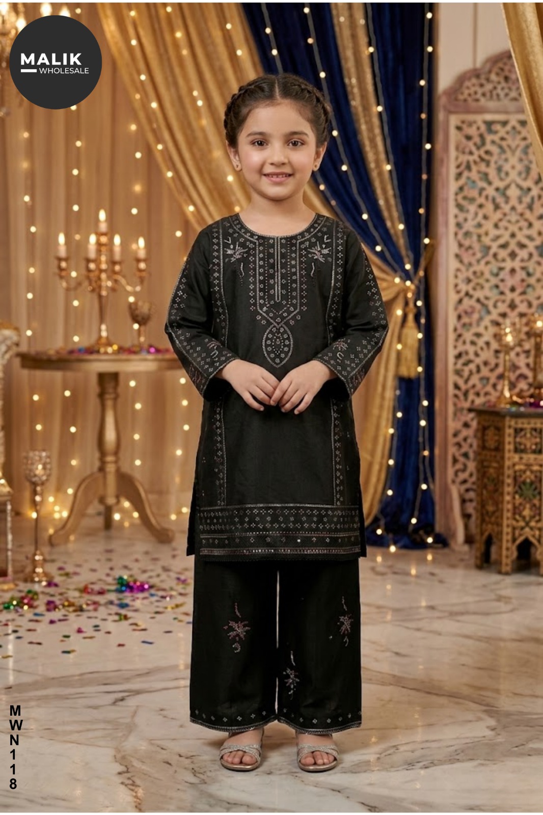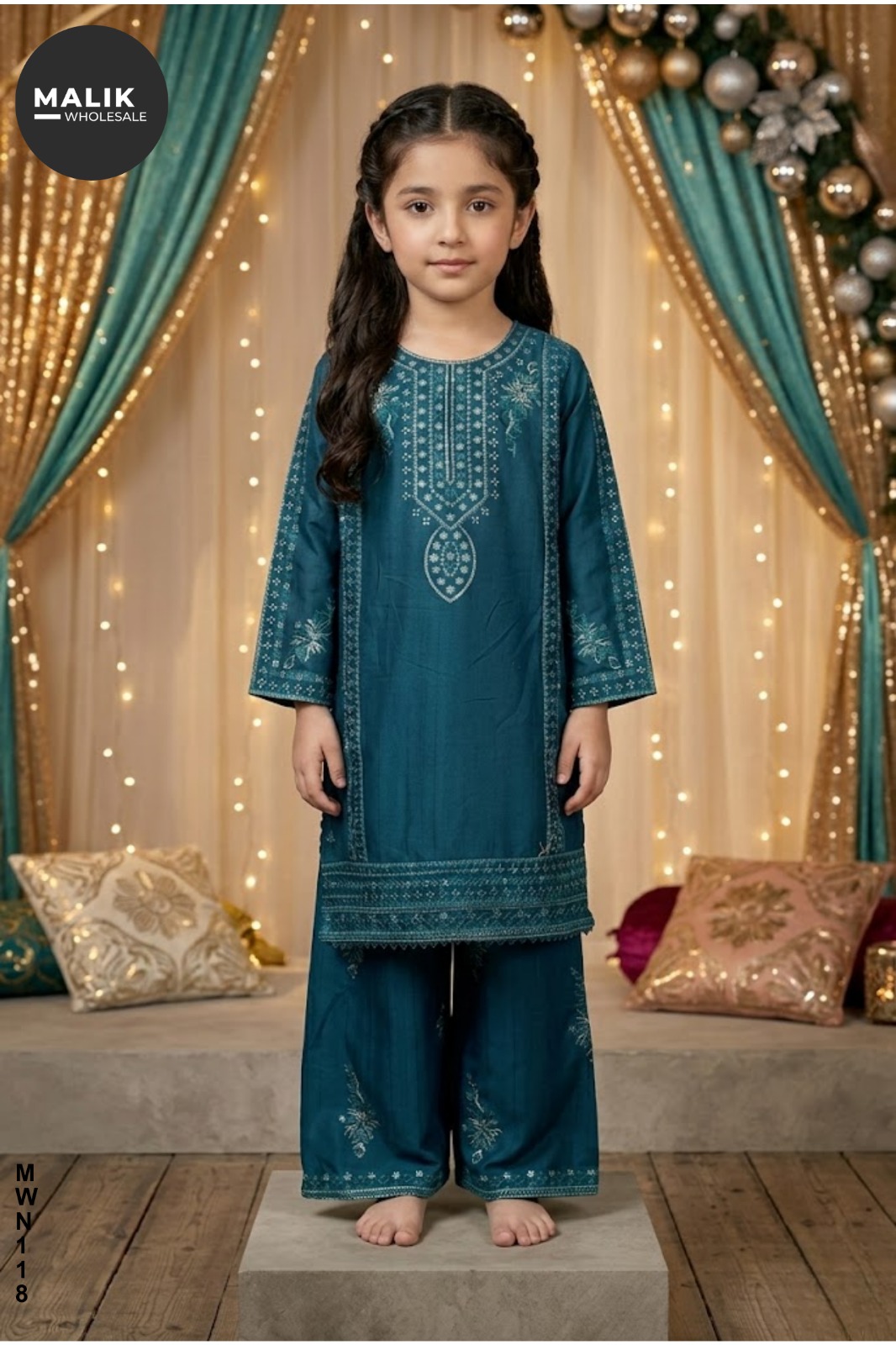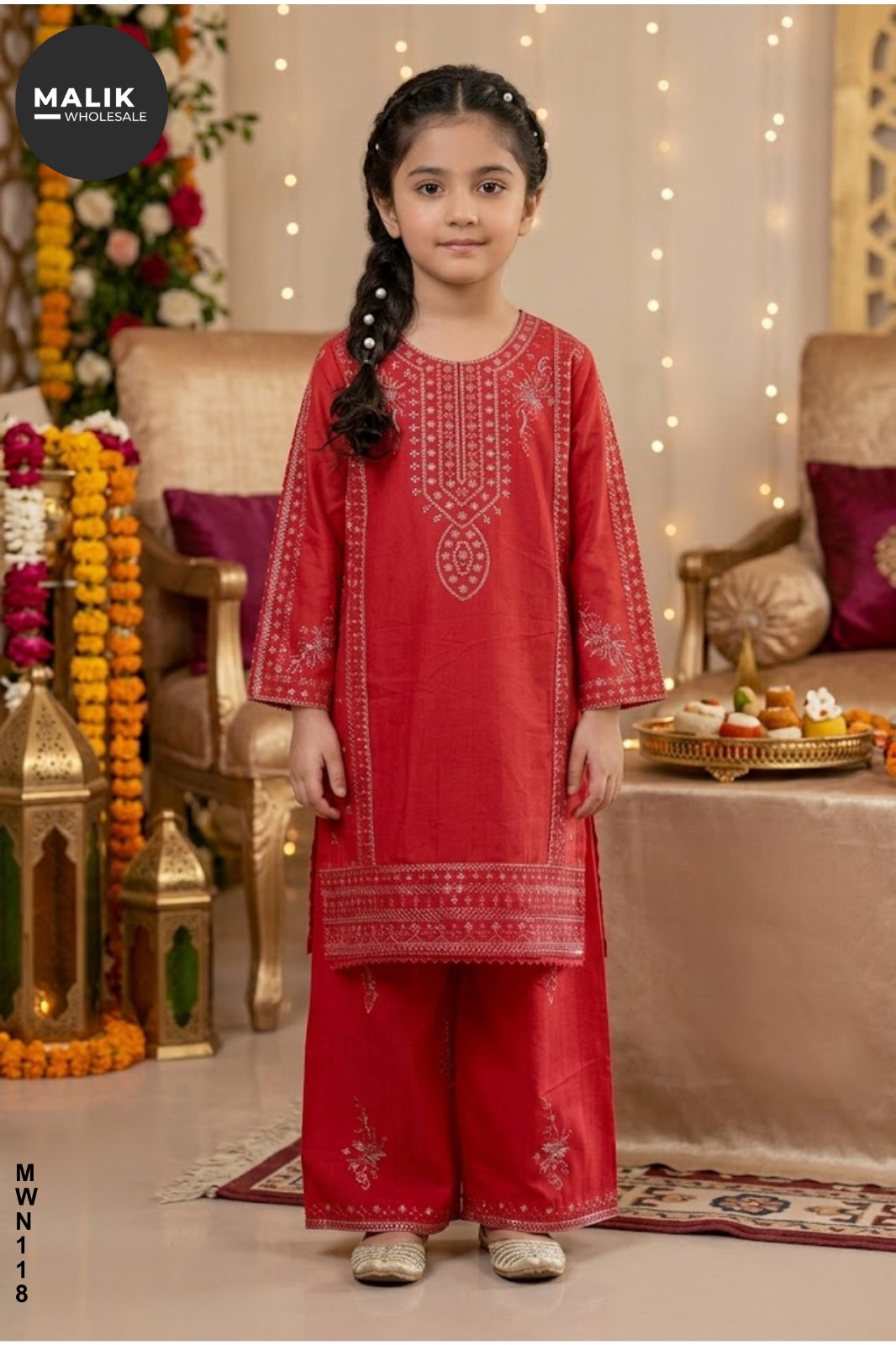 Enhance your kids’ festive collection with the MWN118 Girls 3Pcs Embroidered & Stitched Cotton Midi Shirt Suit, a perfect combination of comfort, elegance, and traditional style. This beautiful outfit is crafted from high-quality cotton fabric that is lightweight, breathable, and comfortable for everyday wear as well as special occasions.